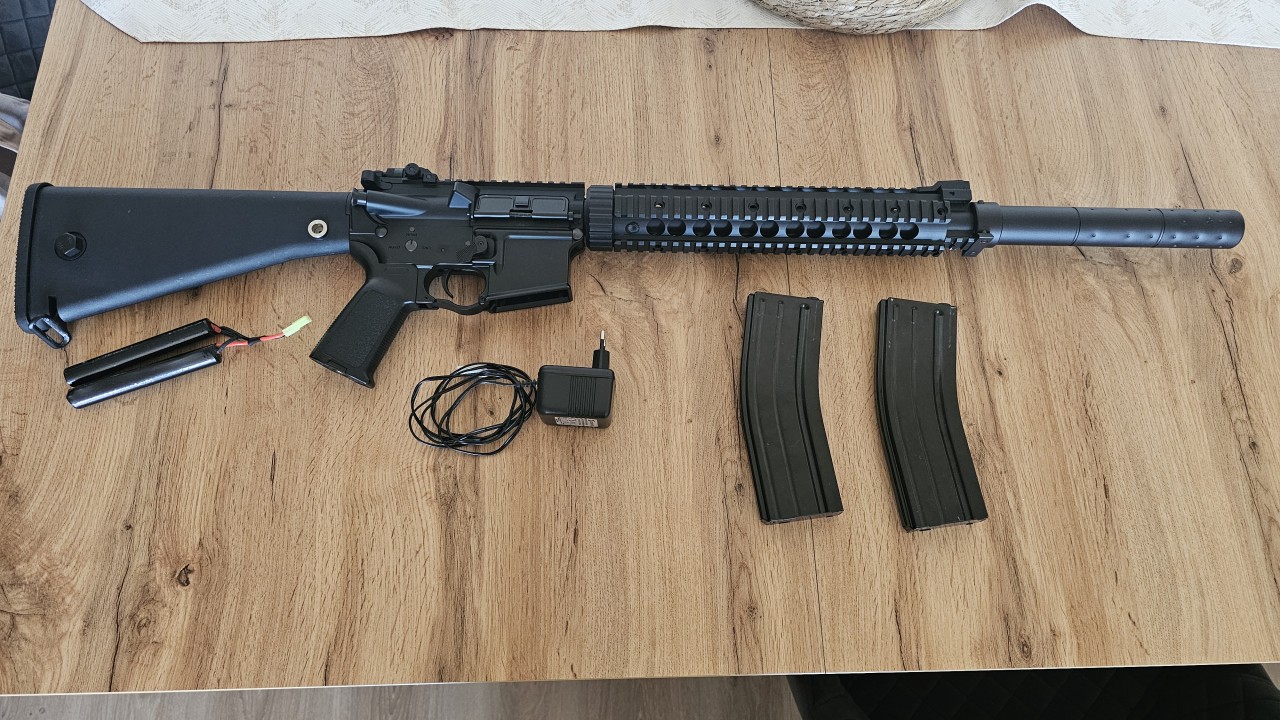 Eladó egy Airsoft Cyma Mk12 tipusú fegyver replika megvételkor teljes szervízelésen átnézésen esett át kapott uj rugót és Hop-up gumit kilett hézagolva igy a fegyver 390-400 FPS-t tud mindössze 4 játékon vett részt a fegyver, kopás van rajta amit a szíjnak az akasztó része koptatott ki. A replika játékra alkalmas állapotban van.